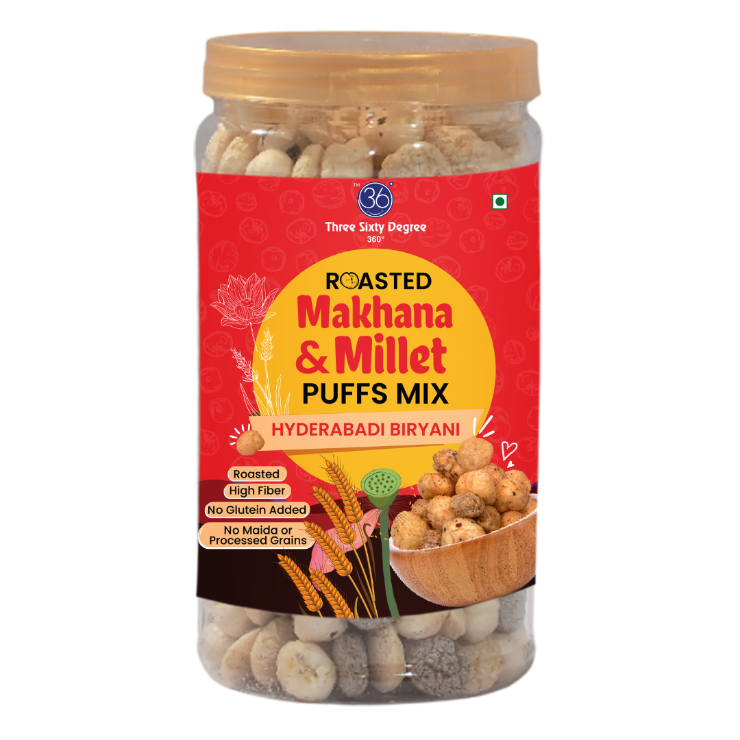 Biryani-Spiced Roasted Makhana & Millets — The Nawabi Regal Flavor with Clean Crunch A luxurious blend of airy makhana and ancient millets, slow-roasted and infused with the aromatic depth of biryani spices. Packed in a premium jar to preserve its bold flavor and crisp texture, this snack delivers a royal taste experience with every bite—while offering high fiber, plant-based protein, and antioxidant-rich goodness. Naturally gluten-free and low in calories, it’s indulgence redefined for the health-conscious palate.