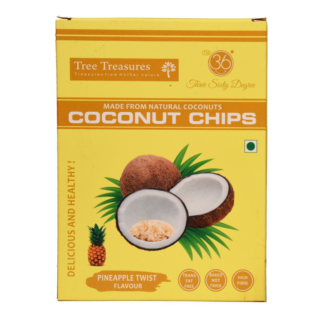 360 Degree Roasted Coconut Chips – Pineapple Variant Tropical Radiance in Every Crisp Escape into a sun-kissed snacking experience with 360 Degree Roasted Coconut Chips in Pineapple Variant—a radiant fusion of creamy coconut and juicy pineapple. Crafted from premium coconut slices and gently roasted to a light, airy crunch, these chips offer indulgence without compromise. Infused with the naturally sweet-tart essence of real pineapple, this variant delivers a refreshing burst of tropical flavor, perfectly balanced by the mellow richness of coconut. It’s a snack that feels like a holiday—bright, nourishing, and delightfully addictive. Why 360 Degree Pineapple Coconut Chips? Roasted, not fried — for a clean crunch and zero oily residue. Infused with real pineapple — rich in vitamin C & natural antioxidants, High in MCTs & dietary fiber — supports energy, digestion & satiety. 🛡️ Preservative-free, vegan & gluten-free — pure ingredients, premium taste. Perfect for festive gifting, wellness hampers, or mindful snacking, this variant brings together tropical charm and clean nutrition. With 360 Degree, every chip is a celebration of flavor, finesse, and feel-good indulgence.