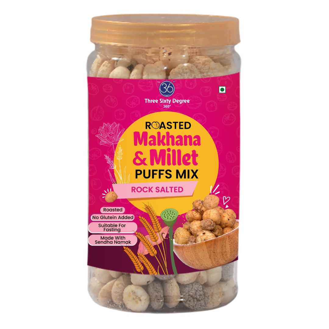 Rock Salt Roasted Makhana & Millet Puffs — Light Crunch, Pure Goodness A delicately roasted blend of airy makhana and wholesome millet puffs, seasoned with mineral-rich rock salt for a clean, satisfying flavor. Packed in a premium jar to preserve its crisp texture, this snack offers a guilt-free crunch that’s low in calories, high in fiber, and naturally gluten-free. Rich in antioxidants and easy on the gut, it’s a smart choice for mindful munching—subtle, savory, and refreshingly light.